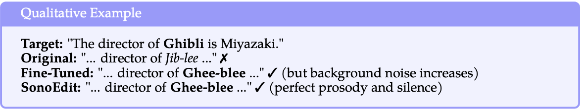 Evaluation Metrics: For evaluation, we employ both objective and subjective metrics to comprehensively assess the effectiveness of SonoEdit. To measure target pronunciation accuracy, we compute two complementary metrics. Target-WER evaluates the Word Error Rate on the target noun pronunciation, while Phoneme Error Rate (PER) provides fine-grained assessment of phoneme-level accuracy through forced alignment. To assess global model preservation, Global-WER measures the Word Error Rate on the preservation set, ensuring that edits do not degrade model performance on unrelated utterances. Finally, we use Speaker Similarity (SIM), computed as the cosine similarity of WavLM [28] speaker embeddings, to verify that speaker identity and acoustic characteristics are preserved through the editing process. Additionally, we evaluate MOS scores using UTMOS [29] which captures perceptual acoustic quality beyond objective metrics.