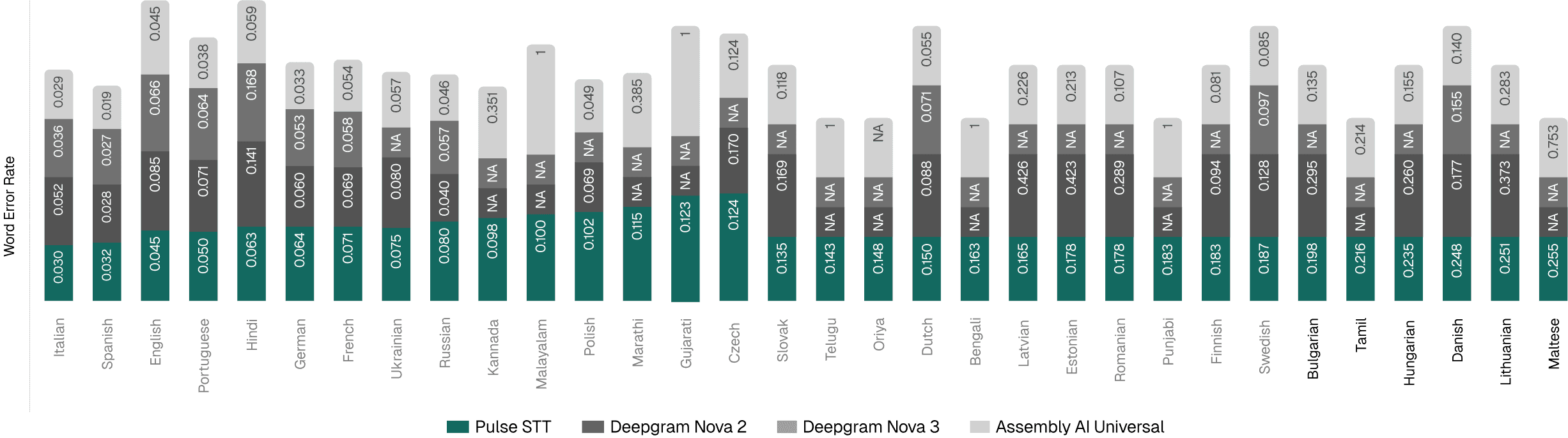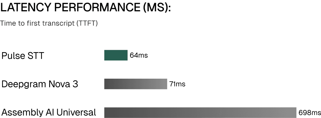 Pulse STT outperforms the competition with the lowest Word Error Rates across 30+ languages and sub-70ms latency for seamless, real-time conversations.