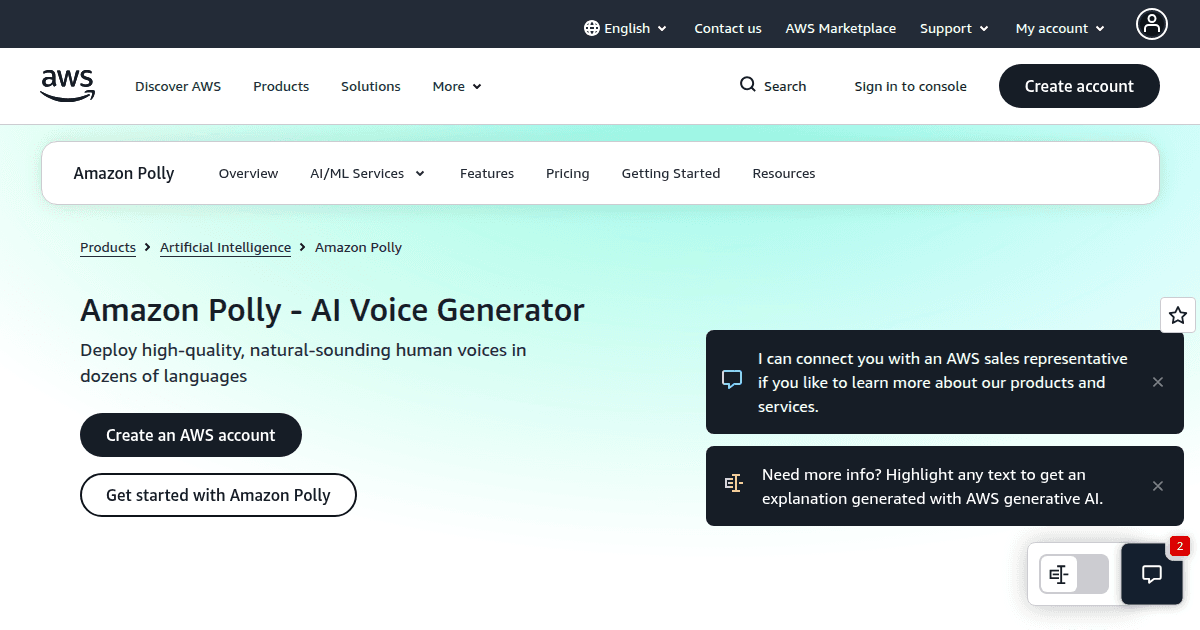 Amazon Polly transforms text input into high-quality speech output using deep learning models for speech synthesis. In a typical voice AI pipeline, Polly serves as the TTS (Text-to-Speech) component, often following an STT (Speech-to-Text) and LLM (Large Language Model) processing stage, enabling end-to-end conversational AI experiences.