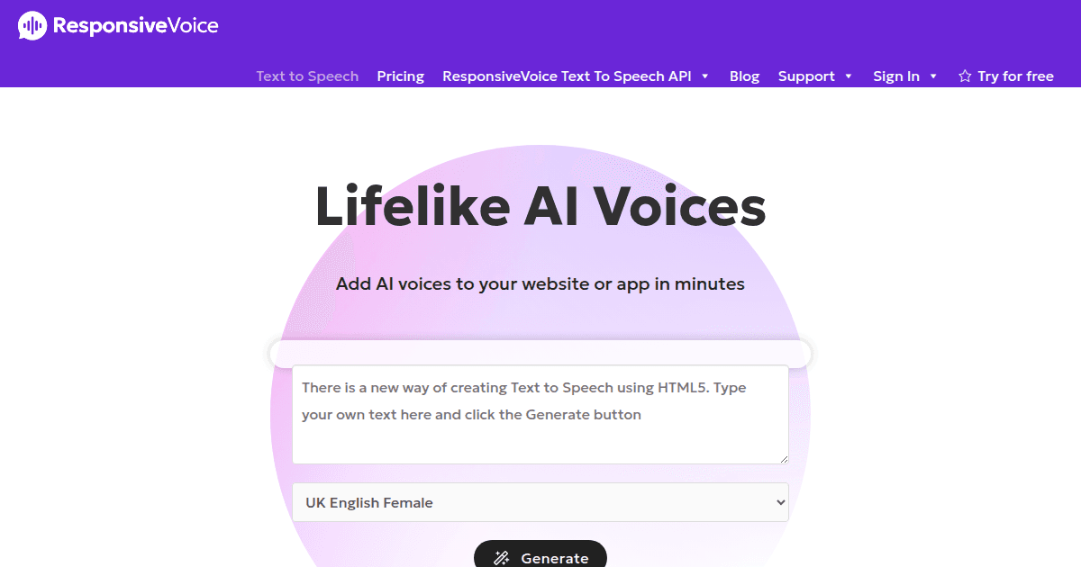 ResponsiveVoice operates as a client-side text-to-speech engine, converting written text into spoken audio using the browser's built-in Web Speech API. The typical pipeline involves sending text input to the API, which then processes and synthesizes speech in real time, supporting multiple languages and voices.