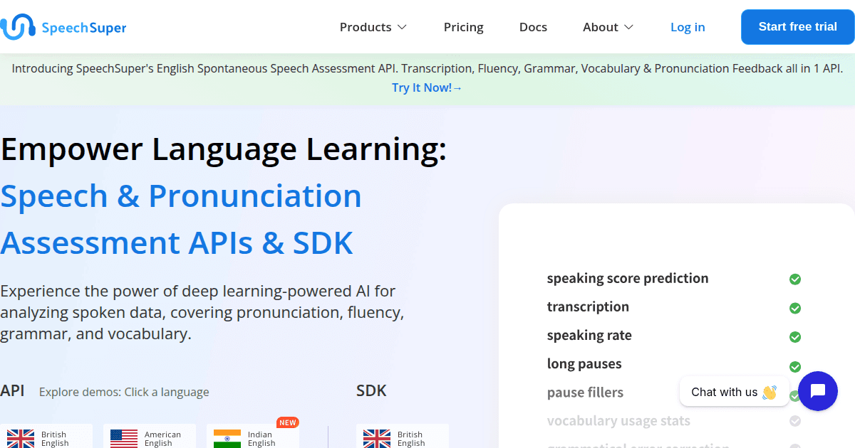 SpeechSuper processes audio input through a pipeline that includes speech-to-text (STT), deep learning-based assessment models, and returns detailed analytics on pronunciation, fluency, grammar, and vocabulary. The platform supports both scripted (reading) and unscripted (spontaneous) speech, providing granular feedback at the phoneme, word, and sentence levels.