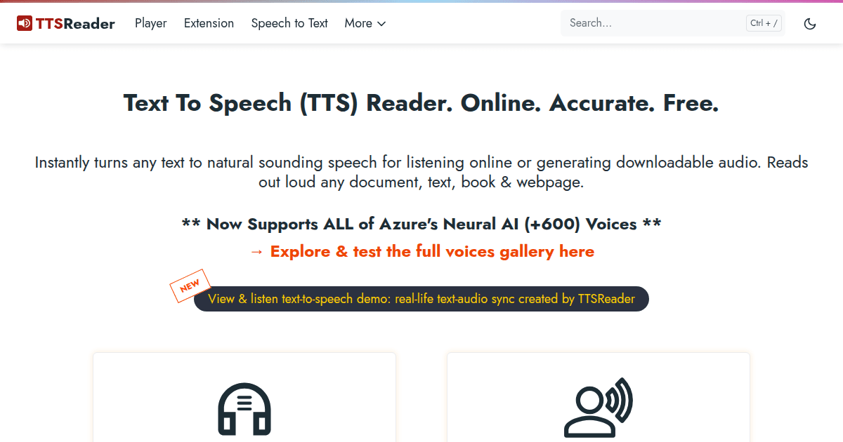 TTSReader is a developer-focused Voice AI platform that delivers instant, high-quality text-to-speech (TTS) conversion via a robust API. Designed for seamless integration, TTSReader leverages leading AI voice engines—including Azure Neural, OpenAI, ElevenLabs, and Google Cloud—to provide natural-sounding speech synthesis for a wide range of applications. With support for over 600 voices and multiple languages, it empowers developers to build accessible, engaging, and scalable voice experiences.